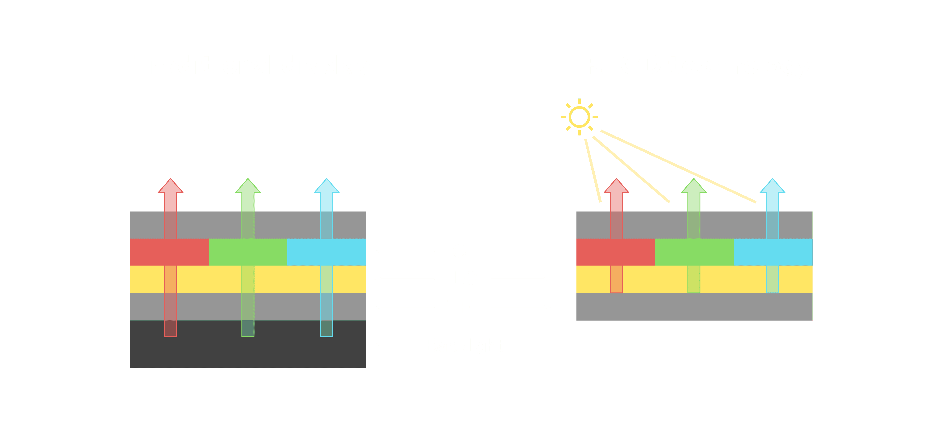 与传统需搭配背光单元的液晶显示相比,,,反射式液晶技术不仅更省电、、更轻薄,,,,且即便在艳阳下仍能清晰显示。。。。此外,,,,少了背光单元,,也大幅降低了 LED 蓝光伤害眼睛的疑虑。。。